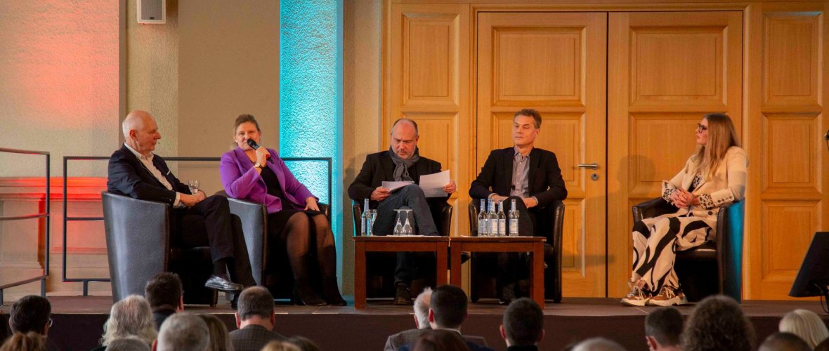 Podiumsrunde 2 mit Silke Steinbach, Moderator Michael Daub, Thomas Bings (WASGAU AG), Julia Hummel (KANGAROOS) und Marco Palumbo (CONVAR)