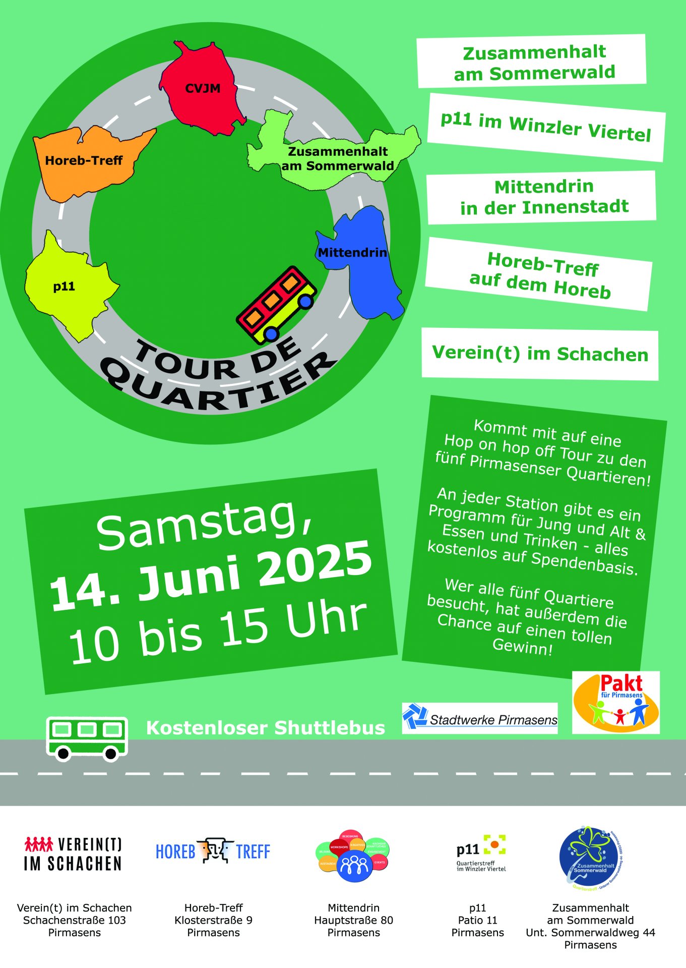 Am 14. Juni 2025 laden das P11 im Winzler Viertel, das Mittendrin in der Fußgängerzone, der Horebtreff auf dem Horeb, "Zusammenhalt am Sommerwald" bei der Familienbildungsstätte und das Projekt "Verein(t) im Schachen" vom CVJM zu einer Rundfahrt durch die Quartiere ein. Ein Bus fährt in regelmäßigen Abständen alle Quartiere an, so kommt man ganz bequem von Station zu Station. Start- und Zielpunkt können frei gewählt werden, wer möchte, kann auch nur einzelne Quartiere besuchen.