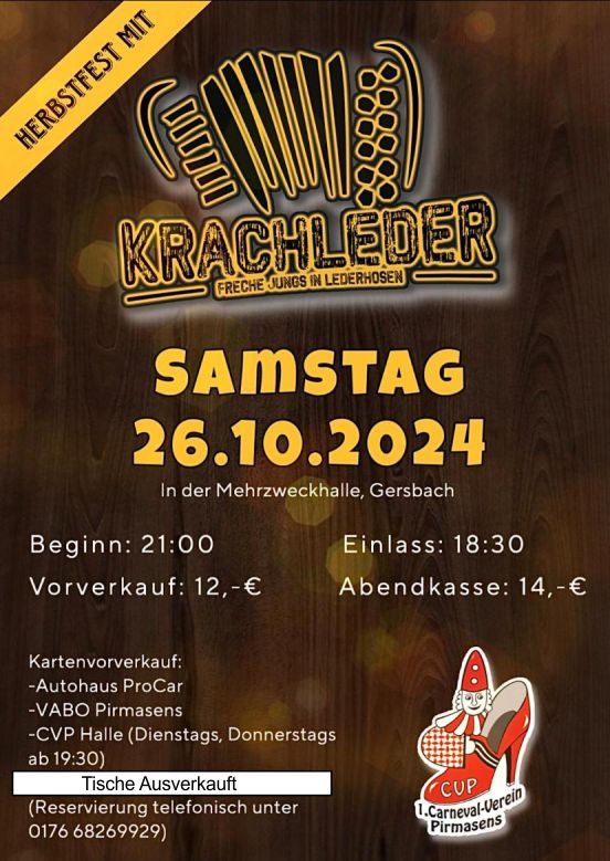 Am Samstag, den 26.10.2024, präsentiert der 1.Carneval - Verein Pirmasens an seinem Herbstfest in der Mehrzweckhalle Gersbach, die ultimative Partyband "Krachleder" aus dem Südwesten der Pfalz.