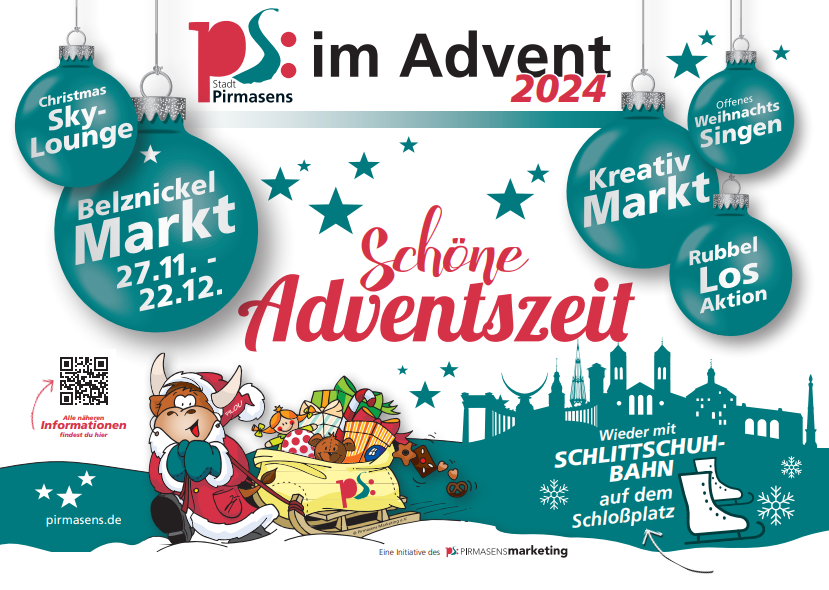 Vom 27. November bis 22. Dezember 2024 findet der Pirmasenser Belznickelmarkt statt und verwandelt den Schloßplatz in der Fußgängerzone in einen kleinen gemütlichen Weihnachtsmarkt mit Blick auf das Alte Rathaus, das sich als einer der größten Adventskalender der Pfalz präsentiert. Der Belznickelmarkt ist längst der Treffpunkt für Familien, Freunde/Bekannte und Arbeitskollegen geworden. In gemütlicher Runde kann man hier die Vorweihnachtszeit ganz ohne Stress genießen.