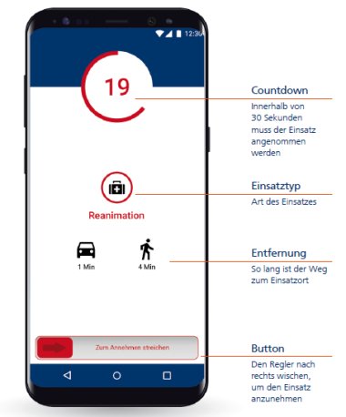 Das System nutzt eine, auf dem Smartphone des Ersthelfers installierte App, die im Falle einer Anforderung dessen Standort mit dem des Notfalls abgleicht und bei räumlicher Nähe den Ersthelfer alarmiert.