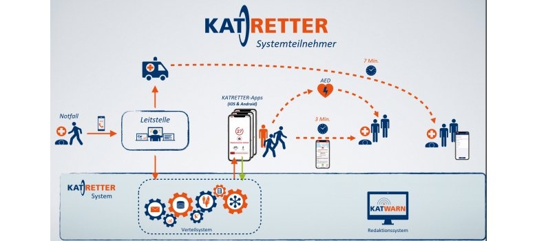 KATRETTER ist ein System zur Alarmierung von freiwilligen Ersthelfern. Befinden man sich in der Umgebung eines Einsatzortes, wird man per KATRETTER-App direkt von der Rettungsleitstelle um Mithilfe gebeten.
