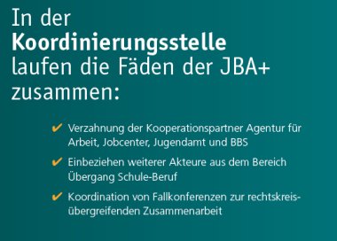Die Jugendberufsagentur plus trägt zur Intensivierung und dem Ausbau der Koordination und Steuerung aller örtlichen Akteure zur Ansprache, Beratung und Betreuung von Jugendlichen mit multiplen Problemlagen bei. Ziel ist die ressortübergreifende Zusammenarbeit, um vorhandene Fördermöglichkeiten sowie finanzielle personelle und sachliche Ressourcen besser aufeinander abzustimmen und zu vernetzen. Eine Verstärkung der aufsuchenden Sozialarbeit in den Milieus der Jugendlichen wird angestrebt.