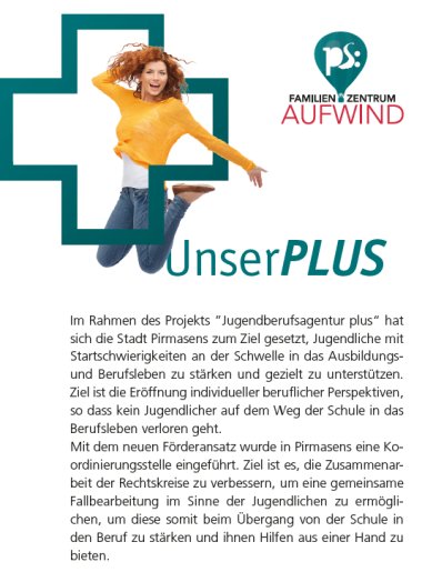 Die Verflechtung der Problemlagen der in Pirmasens lebenden jungen Menschen ist meist komplex und vielschichtig und erfordert eine vernetzte Herangehensweise der verschiedenen Sozialleistungssysteme. Die Erfahrung hat gezeigt, dass die Lebenslage von jungen Menschen und ihren Familien ganzheitlich in den Blick genommen werden muss, um ebenso ganzheitliche Handlungs- und Hilfekontexte gestalten zu können, die nachhaltig wirken. Der Sitz der Koordinierungsstelle JBA plus befindet sich im Familienzentrum Aufwind. Diese ist eine zentrale Anlaufstelle für junge Menschen und deren Familien mit dem Ziel der Auflösung der "Versäulung" bestehender Hilfen sowie der Etablierung einer vernetzten Herangehensweise.