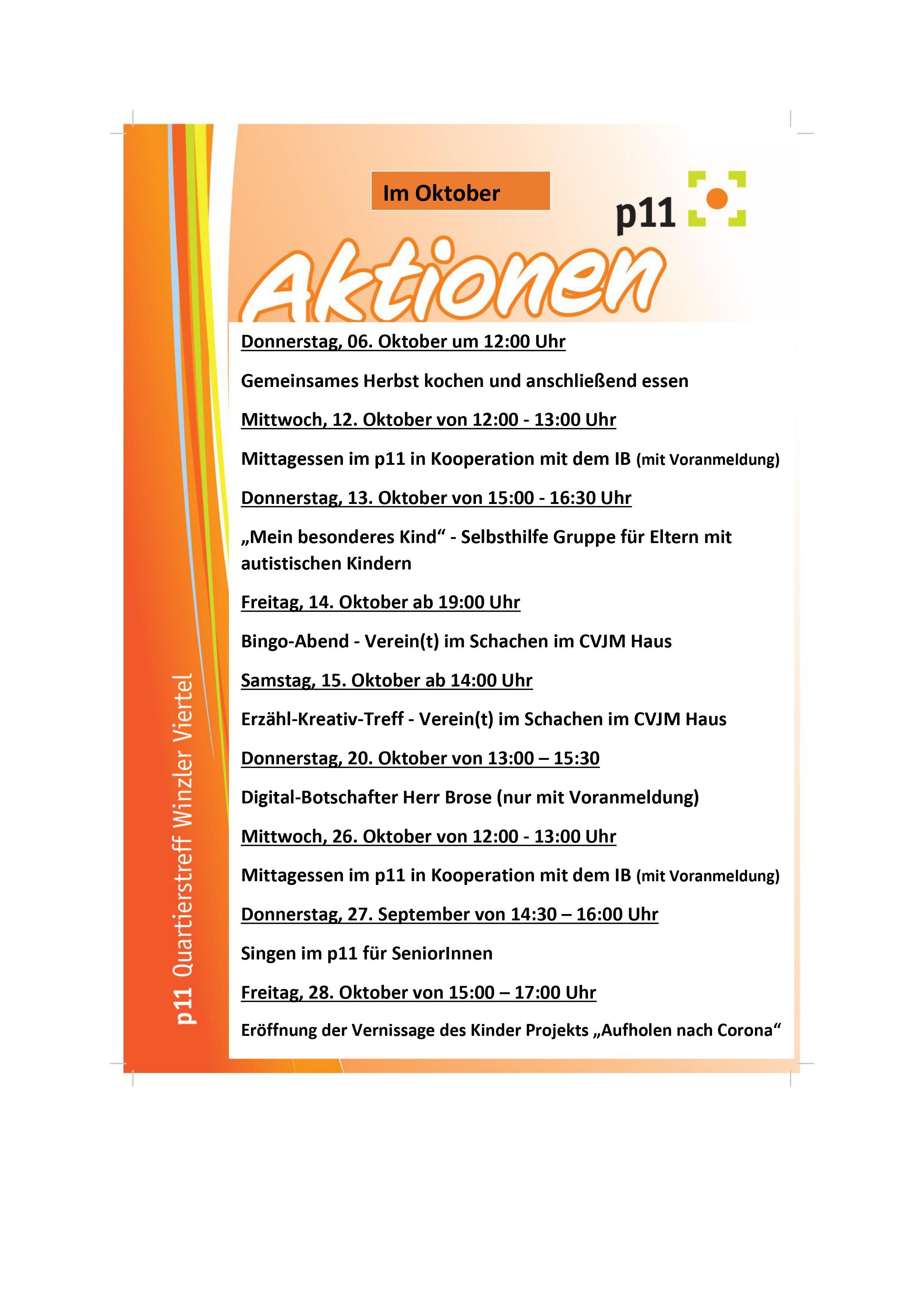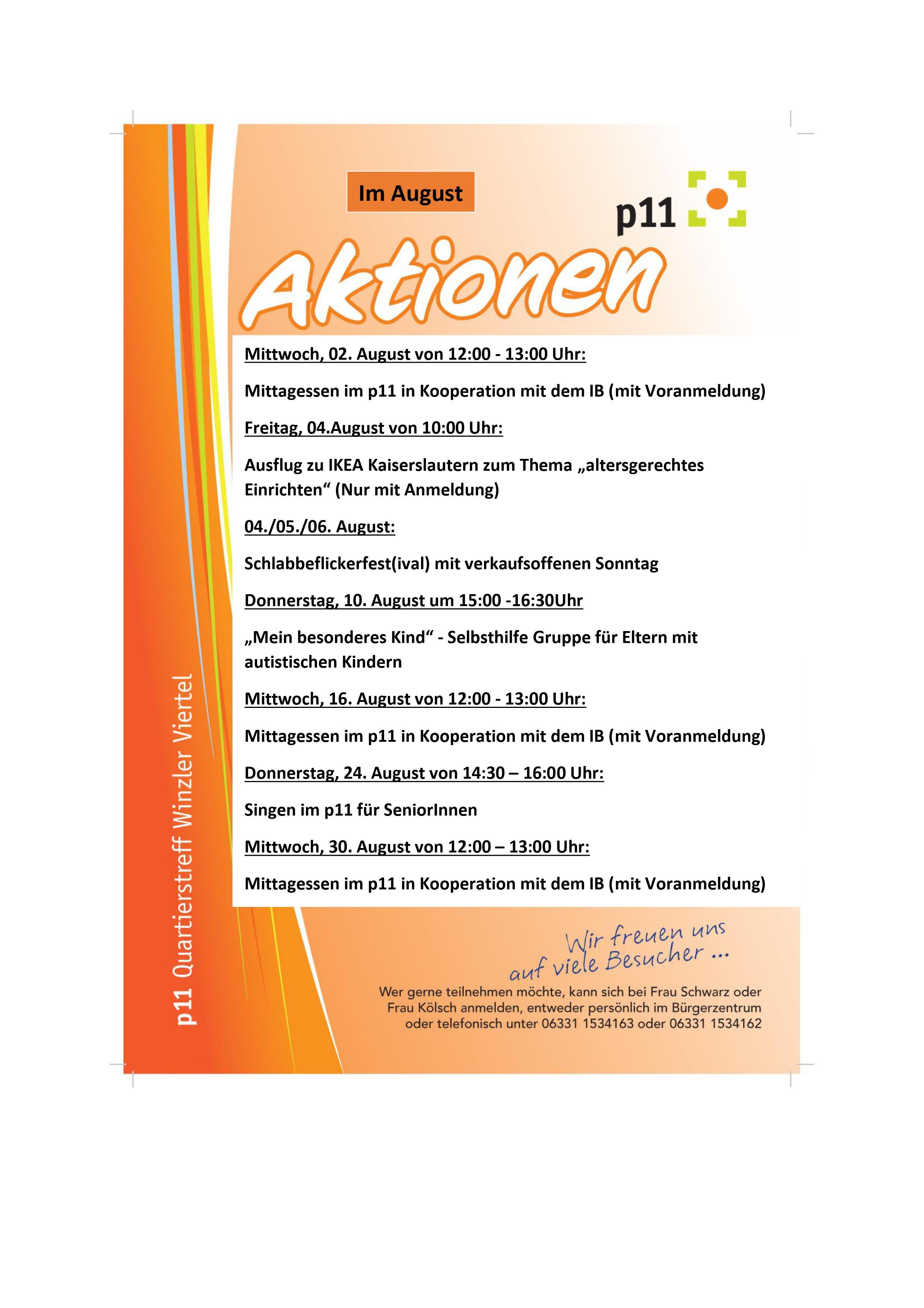Das p11 ist ein Begegnungszentrum für alle Menschen des Winzler Viertels. Das bedeutet, dass hier Raum für alle Menschen aus jeder Altersgruppe ist um gemeinsam in Kontakt zu kommen und zusammen Aktivitäten zu erleben und sich auszutauschen.
