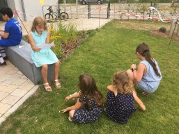 Es werden Geschichten gemeinsam gelesen und ein spielerischer Zugang zu Büchern hergestellt.