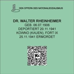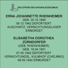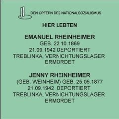 Emanuel Rheinheimer, geboren 1869 in Pirmasens, ermordet 1942 im Vernichtungslager Treblinka, Jenny Rheinheimer, geborene Weinheim, geboren 1877 in Freiburg/Breisgau, ermordet 1942 im Vernichtungslager Treblinka, Erna Johannette Rheinheimer, geboren 1899 in Pirmasens, ermordet 1942 im Vernichtungslager Auschwitz, Elisabetha Dorothea Rheinheimer, geboren 1901 in Pirmasens, verheiratete Elisabeth Zürndorfer, ermordet 1942 im Vernichtungslager Kulmhof (Chelmo), Dr. Walter Rheinheimer, geboren 1906 in Pirmasens, ermordet 1941 im Konzentrationslager Kowno.