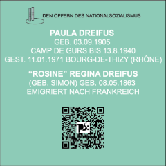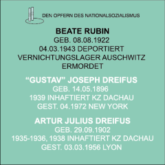 Abbildungen in der Reihenfolge der Gedenktafeln: David Rubin, Olga Rubin, geb. Dreifus, Beate Rubin, "Gustav" Joseph Dreifus, Artur Julius Dreifus, Paula Dreifus, "Rosine" Regina Dreifus © StArchiv Pirmasens, Kennkartensammlung. Weitere Bilder: Artur und Ruth Dreifus mit Paul und Evelyne © Eloise Girault, mit freundlicher Genehmigung