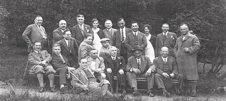„Zu den Stammkunden des Restaurants Mayer zählten auch Mitglieder dieser Kegelgesellschaft, Foto Anfang der 1930er Jahre. In der oberen Reihe von links nach rechts: Robert Mayer, Dr. Siegfried Basnizki, Levy, Katz, Dannheißer, Rabbiner Dr. Dagobert Nellhaus, Levy, Karl Kahn. Mittlere Reihe: (Siegfried?) Seligmann, Ernst Levy, Dr. Richard Weis, Erich Haas, Alfred Feinberg. Untere Reihe: Karl Alexander, Mulco (?), Willi Meier, Adolf Fuchs.“