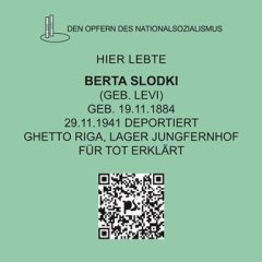 Frau Berta Slodki ging im Juli 1939 von Pirmasens nach Frankfurt am Main und von hier aus nach Nürnberg, wo sie bis November 1941 in der Lenbachstraße 6, II bei Familie Metzger wohnte. Am 29.11.1941 wurde Frau Slodki von Nürnberg Lager-Langwasser nach dem KZ Riga-Jungfernhof deportiert und dort sofort ermordet.