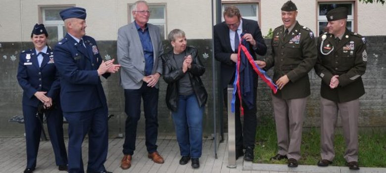Die Texte für den Audioguide wurden von Gisela Looper (im Bild 2. von links) und Kenny Coleman (1. von rechts), einem US-Soldaten im Ruhestand, eingesprochen. In Kooperation mit Marina Hilbert (Bildmitte) wurde durch das Stadtarchiv, in Organisation von Norman Salzmann, zur Einweihung eingeladen. Neben vielen weiteren Gästen waren auch Vertreter der US Army vor Ort: Colonel Deon D. Maxwell, Sergeant Major Colburn und Executive Assistant Petra Pauer vom U.S. Army Medical Material Center Europe. Von der Ramstein Airbase kamen Colonel Wesley Eagle, Lieutenant Colonel Alison Freimman und Host Nation Advisor Jannik Ehlert sowie Helmut Haufe, der General Manager 21st TSC zur Einweihung. Die Zeitung "Stars and Stripes“ berichtete im Anschluss über die Veranstaltung.