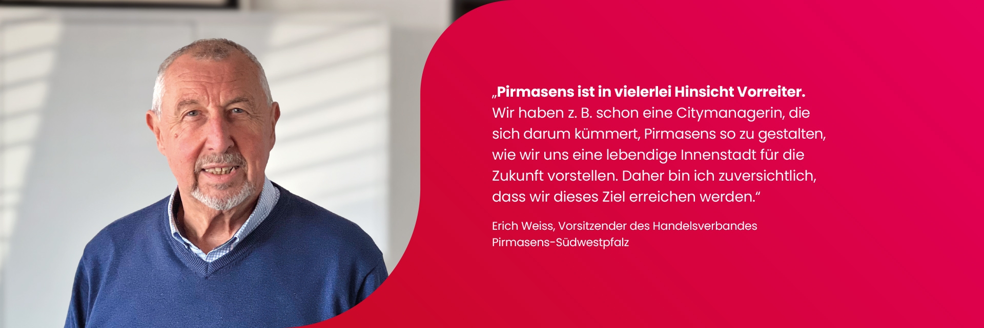 Die Innenstadt von Pirmasens ist ein lebendiges, attraktives und vielfältiges Zentrum, in dessen Mittelpunkt der besondere Charme der Stadt, das „Bärmesenser Vivre“, steht. Belebte Plätze und Straßen fördern das gesellschaftliche Miteinander und schaffen eine Atmosphäre, in der sich alle sicher und wohl fühlen.