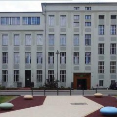 Das Schulgebäude bestand ursprünglich aus zwei getrennten Gebäuden, die eine unterschiedliche Nutzung beinhalteten. Der Gebäudeteil Nr. 24 wurde um 1900 als Wohn- und Geschäftshaus erbaut, während der Gebäudeteil Nr. 22 um 1905 als Mädchengymnasium errichtet wurde. Beide Gebäude stehen unter Denkmalschutz und besitzen eine reichgegliederte Sandsteinfassade mit neugotischen und neubarocken Stilelementen, die das Stadtbild und den Straßenraum prägen. Schwere Mängel beim Brandschutz und der Tragkonstruktion, sowie erhebliche Defizite bei der technischen Ausstattung machten eine Generalsanierung erforderlich. Während der Gebäudeteil 22 in seiner Grundstruktur als Schulhaus mit der historischen Bausubstanz erhalten blieb, wurde der Gebäudeteil 24, bis auf die Straßenfassade, komplett zurück gebaut und durch einen Neubau ersetzt.