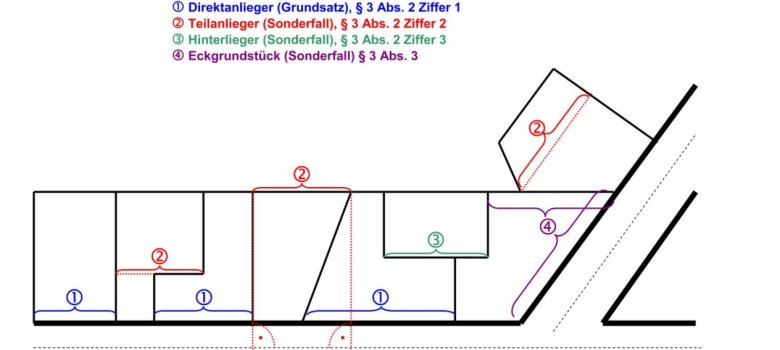 Die Veranlagung zu Straßenreinigungs- und Winterdienstgebühren erfolgt nach Reinigungsklassen (Häufigkeit der Reinigung) sowie (teilweise fiktive) Frontmeterlängen. Die die Bestimmung der fiktive Frontmeterlänger ist der vom Gemeinde- u. Städtebund in Mustersatzungen vorgeschlagene und durch gängige Rechtsprechung bestätigte Maßstab der sinngemäß breitesten Ausdehnung des Grundstücks zur jeweiligen Straßenfront. Dies kann je nach Grundstückszuschnitt auch im hinteren Bereich eines Grundstückes sein (dann sog. Teilanlieger). Siehe Beispielsbilder in anhängender Anlage. Dabei kann das Grundstück als wirtschaftliche Einheit auch aus mehreren Flurstücken gebildet werden.