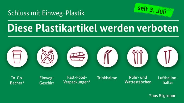das gilt z. B. für Einweg-Geschirr aus Plastik, To-go-Becher und Styropor-Boxen, Trinkhalme, Rührstäbchen, Luftballonstäbe, Wattestäbchen u. a. m. Verboten werden auch Wegwerfteller, -becher oder -besteck aus sogenanntem „Bioplastik“ oder biologisch abbaubaren Kunststoffen. Das Gleiche gilt für Einwegteller und -schalen aus Pappe, die nur zu einem geringen Teil aus Kunststoff bestehen oder mit Kunststoff überzogen sind.