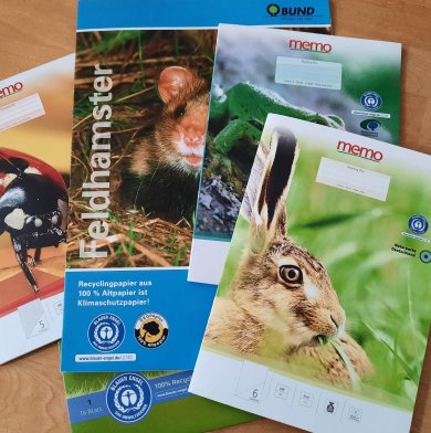 Grundsätzlich gilt: Papier, das aus Altpapier hergestellt wurde, belastet die Umwelt sehr viel weniger als Papier aus frischem Holz. Beim Kauf der Schulhefte sollten Eltern daher auf die Kennzeichnung mit dem Blauen Engel achten. Das garantiert, dass die Hefte aus 100 Prozent Altpapier hergestellt wurden und bei der Produktion der Wasser-, Energie- und Chemikalieneinsatz reduziert sind.