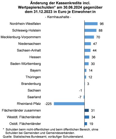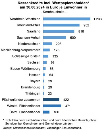 Wie groß die Not der Betroffenen ist, zeigt die jüngste Berechnung des Aktionsbündnisses. Danach mussten Städte und Gemeinden bundesweit im ersten Halbjahr 2024 rund 2,4 Milliarden Euro neue Kassenkredite aufnehmen. Ohne die erstmalige Wirkung des Entschuldungsprogramms in Rheinland-Pfalz, das zu einer Senkung um 949 Millionen Euro geführt hat, beträgt der Kreditzuwachs sogar 3,34 Milliarden Euro. Damit steigt die Summe der Liquiditätskredite in Deutschland auf rund 33 Milliarden Euro.