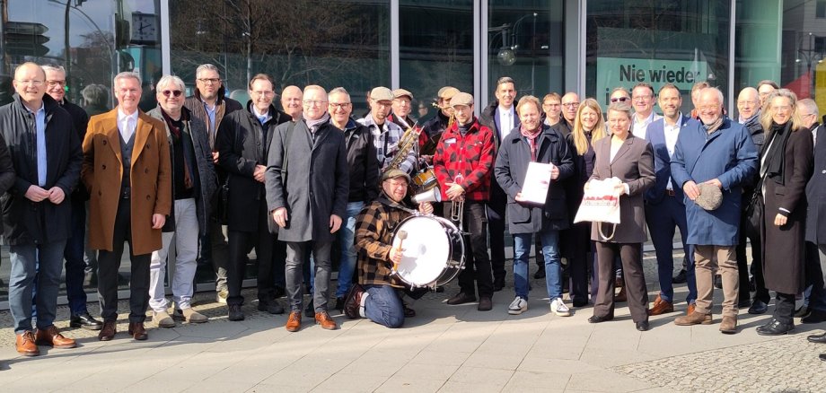 Das politische Berlin hat am Freitagmittag ein besonderes musikalisches Highlight erlebt. Vor dem Konrad-Adenauer- und dem Willy-Brandt-Haus spielten Drummer der Gruppe It’s live zwei kurze Konzerte. Die Band war Teil des Besuchs vom Aktionsbündnis „Für die Würde unserer Städte“. Darin haben sich finanzschwache Kommunen aus acht Bundesländern zusammengeschlossen. Deren Bürgermeisterinnen und Bürgermeister, Kämmerinnen und Kämmerer präsentierten vor den Parteizentralen ihre Forderungen für die Koalitionsverhandlungen. Das passende Motto: „Wer die Musik bestellt, muss sie auch bezahlen“.