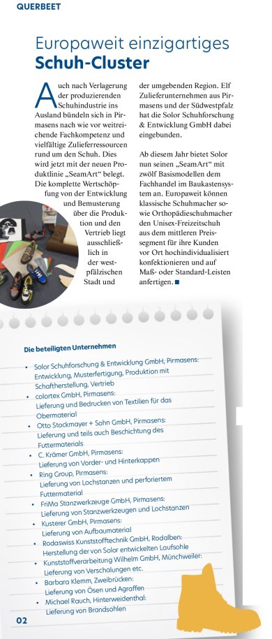 Das IHK-Magazin und das PT-Magazin berichten über die neue Produktlinie "SeamArt" der Solor-Schuhforschung und Entwicklung GmbH in Pirmasens.